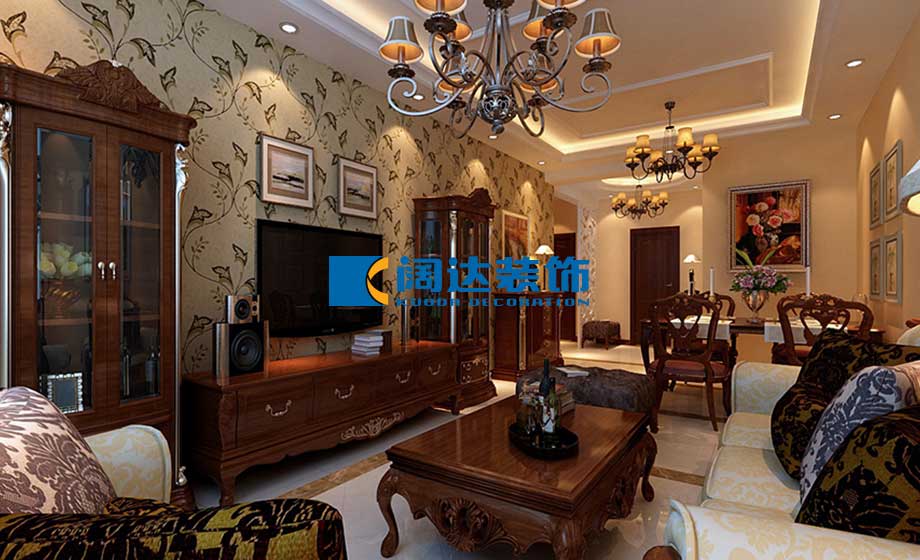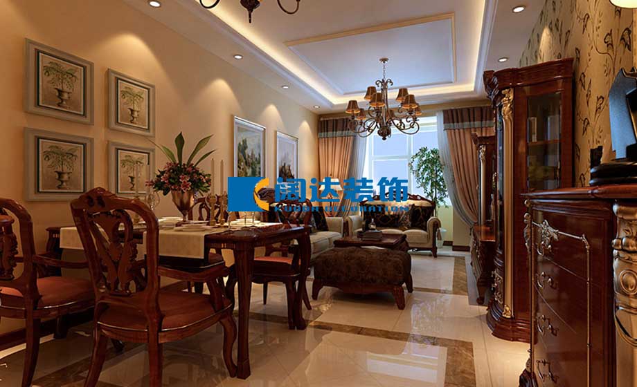 客餐廳:本案例用暖色的燈光烘托歐式的華貴檔次,深色歐式家具配以淺綠色的葉子型壁紙,為家居空間增添了一絲生命活力,玄關區域的圓形吊頂與客餐廳區域的方形吊頂配合地面的撥打線斜鋪拼花對空間功能進行了明確的劃分,提升了家居空間的整體檔次。