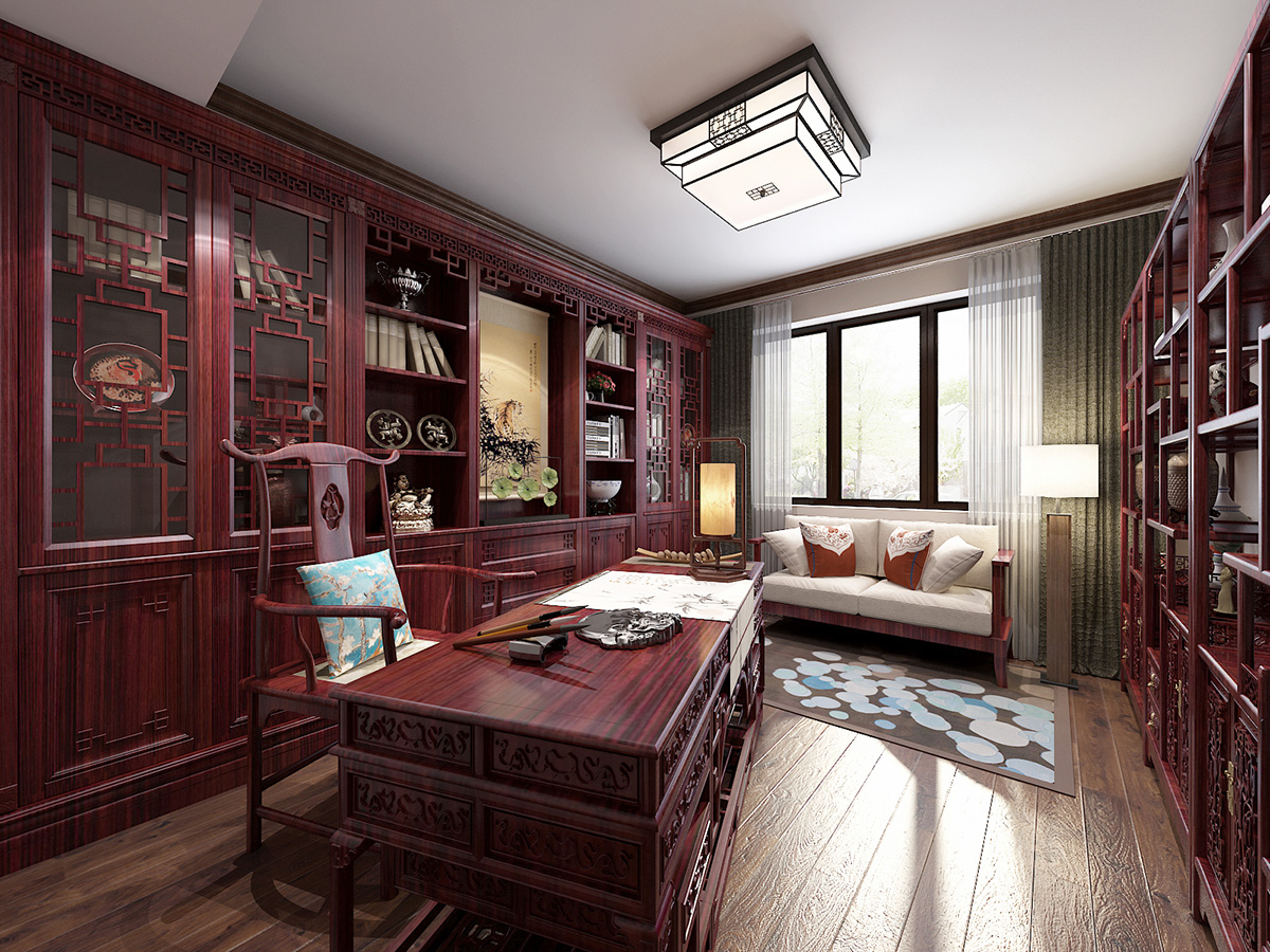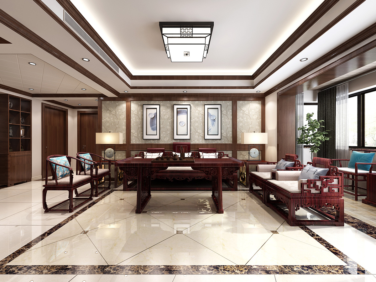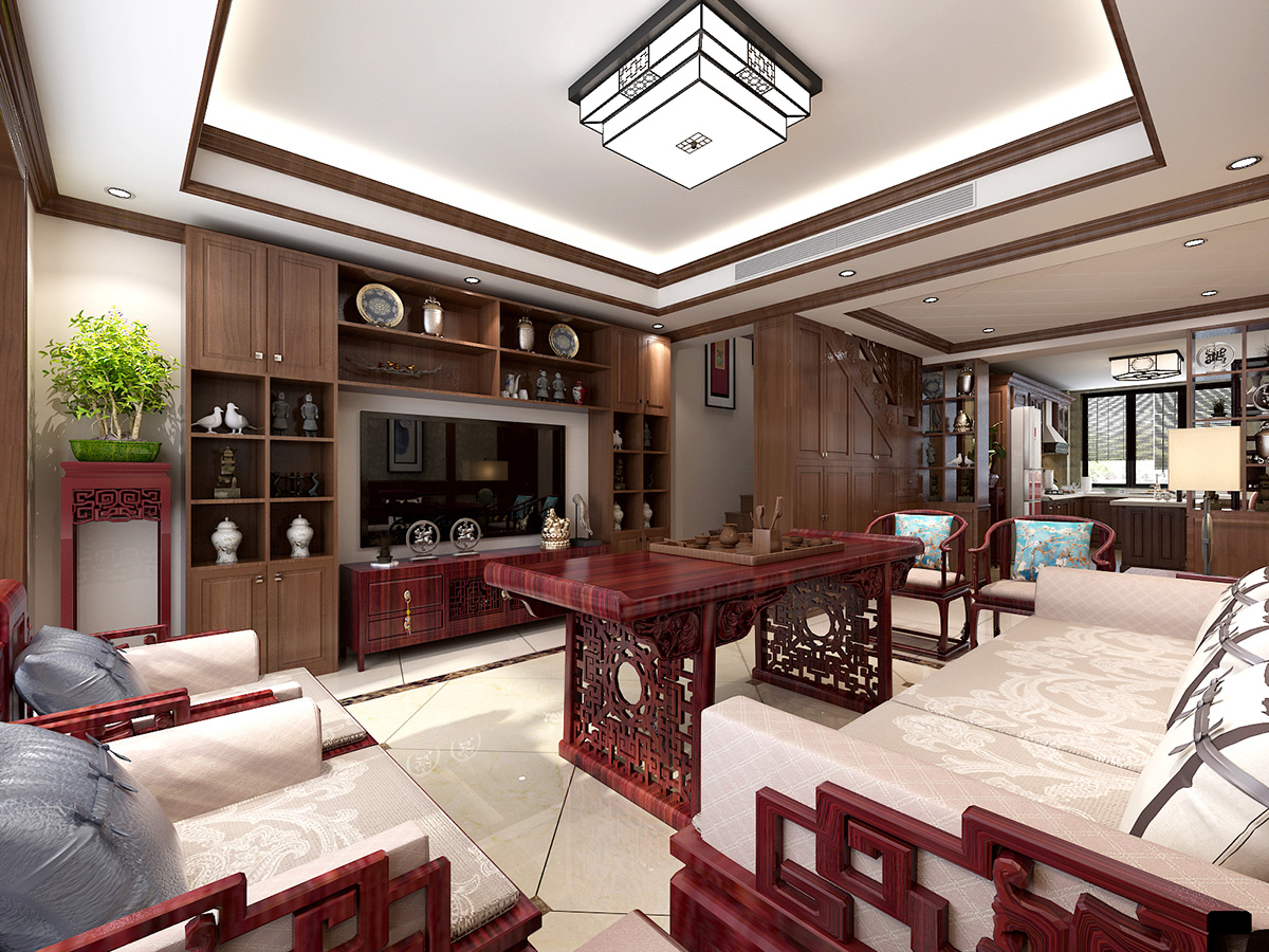 室內多采用對稱式的布局方式,格調高雅,造型樸素優美,色彩濃厚而成熟。空間上講究層次,多用隔窗、屏風來分割,用實木做出結實的框架,以固定支架,中間用欞子雕花,做成古樸的圖案。一般都以木結構為主,中式風格都會比較對稱。另外會增加國畫、字畫、掛飾畫等做墻面裝飾,另外會增加些盆景以求和諧。