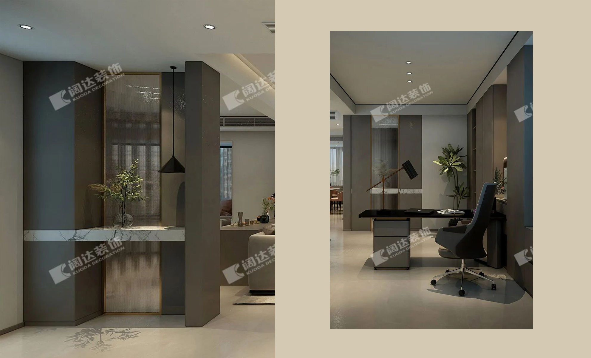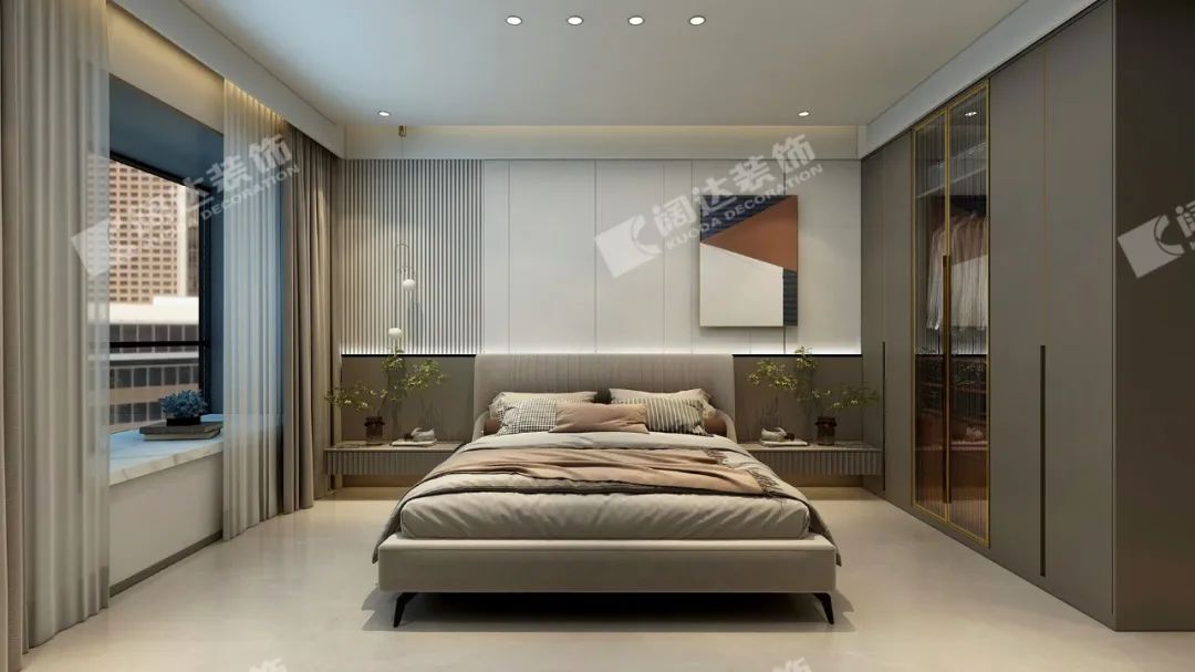 在整個(gè)空間中,不論是客廳、書房還是臥室都用了木色格柵鋪墊;一門到頂?shù)墓耋w、木門等看似簡(jiǎn)潔的造型和搭配,延展出優(yōu)雅的調(diào)性,讓居住者輕易感受到生活的真趣。