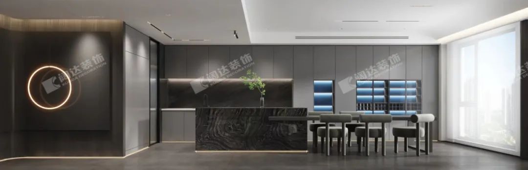 將廚房與餐廳打通,視覺上連為一體,前后呼應,中島式的設計在餐廳增添了社交趣味的同時,又考慮了餐廳的儲物收納。大理石與趣味雕塑相遇,在下照燈的光影下,呈現出塊面的立體感,傳達著亙古不變的高級與時尚。落地窗良好的采光和視野,更在這看似低調的氛圍中,渲染出一層兼收并蓄的微妙氣質。