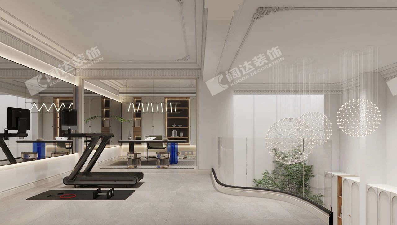 隔層區(qū)域是健身區(qū)和主人書房區(qū)域,為了在視覺上放大空間,將健身區(qū)的鏡子延伸穿插到書房里面,用氛圍燈進行鏈接,看似單獨的兩個空間,卻又有著緊密的聯(lián)系。