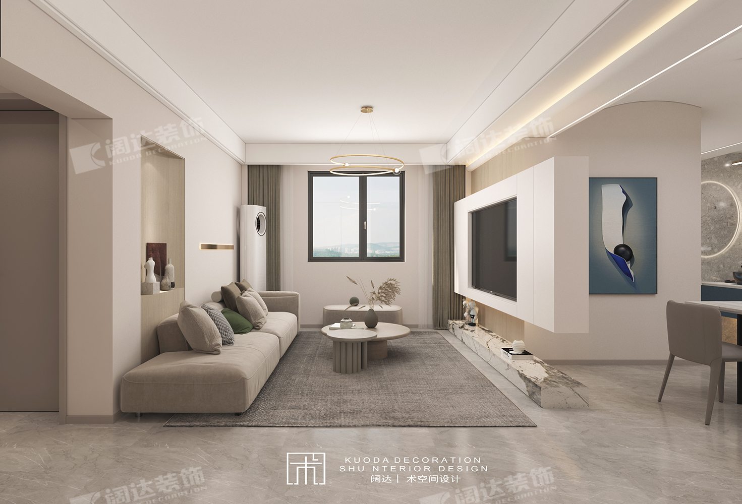 通過改變臥室門方向,延長了客廳墻面,正好將沙發由南朝北放置于此,對面電視背景做懸空處理,將光線引入餐廳,整個區域采光、動線和比例較為適宜。