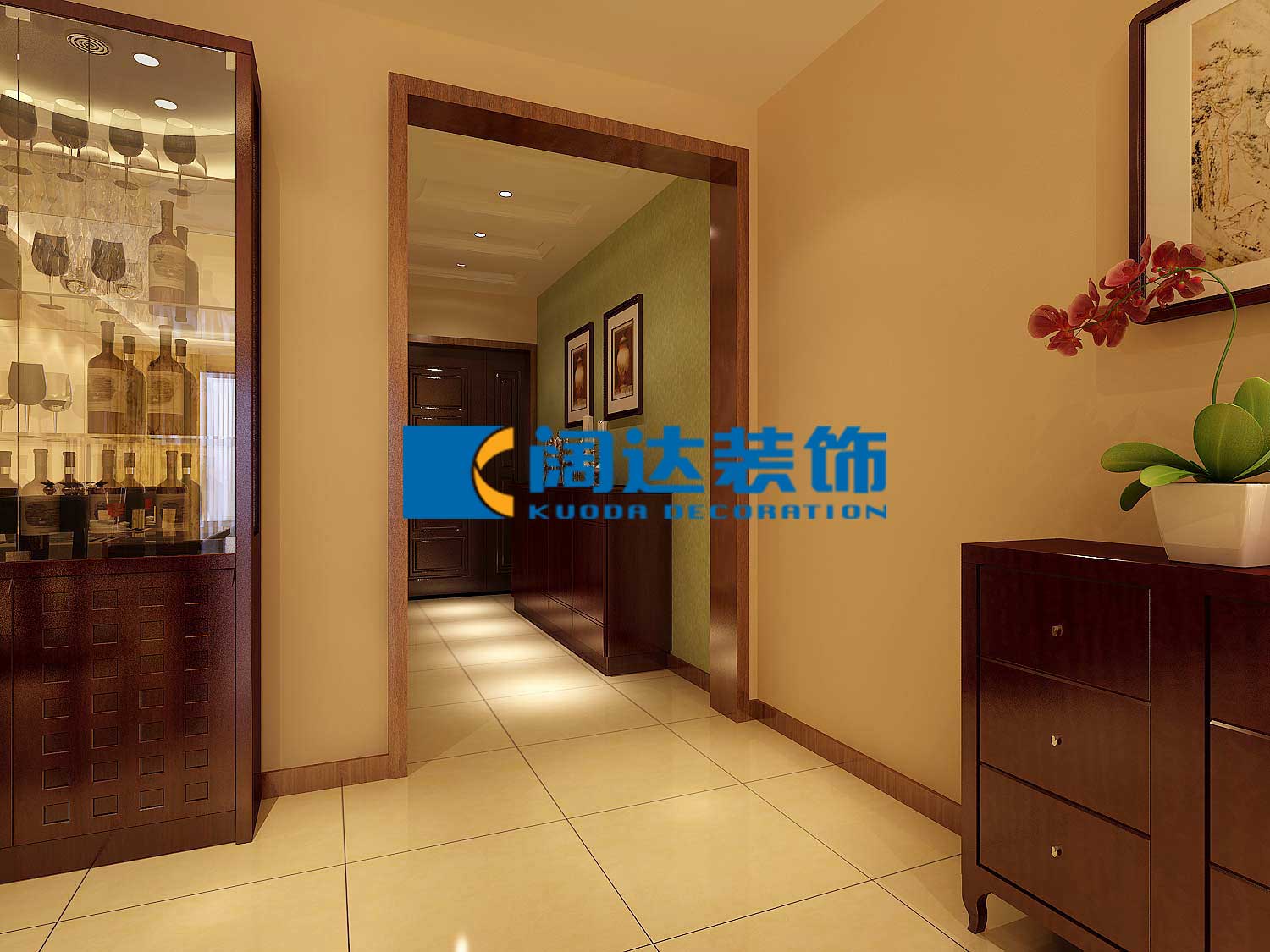 本案例為中年夫婦的第一生活居所。但在本案例用華日家具,與摩曼的墻紙,芬琳墻面乳膠漆,通過木色與墻面米色的對比。形成室內的兩大基調色,頂面的白色把整體空間提亮增加室內的高度感。